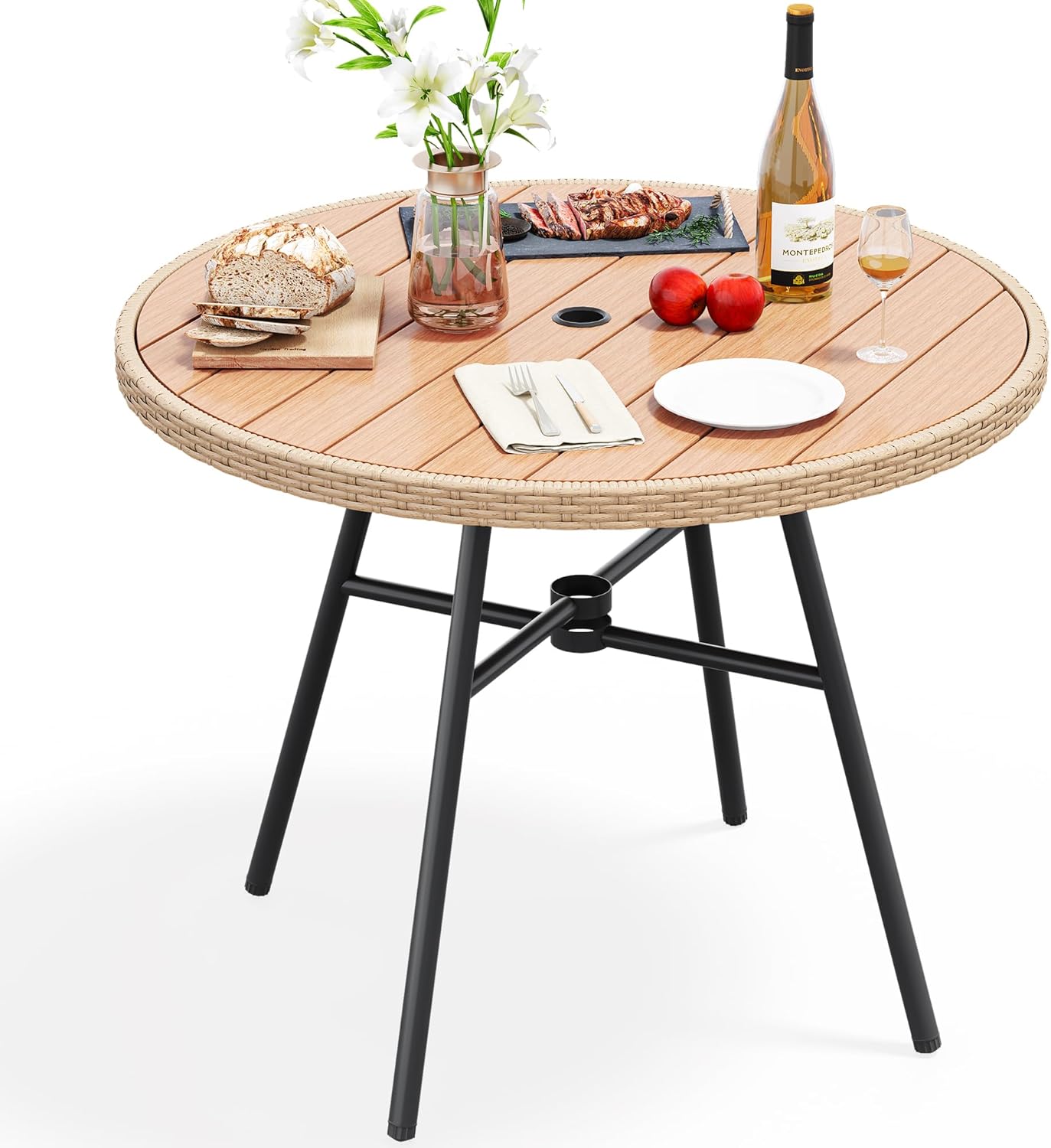 - Plastic Wood Tabletop: This 36.6-inch round dining table features a sturdy plastic wood tabletop and UV-proof PE rattan edging for strong durability and easy wiping maintenance; Spacious and strong to conveniently hold your cutlery, foods, drinks, and decorations