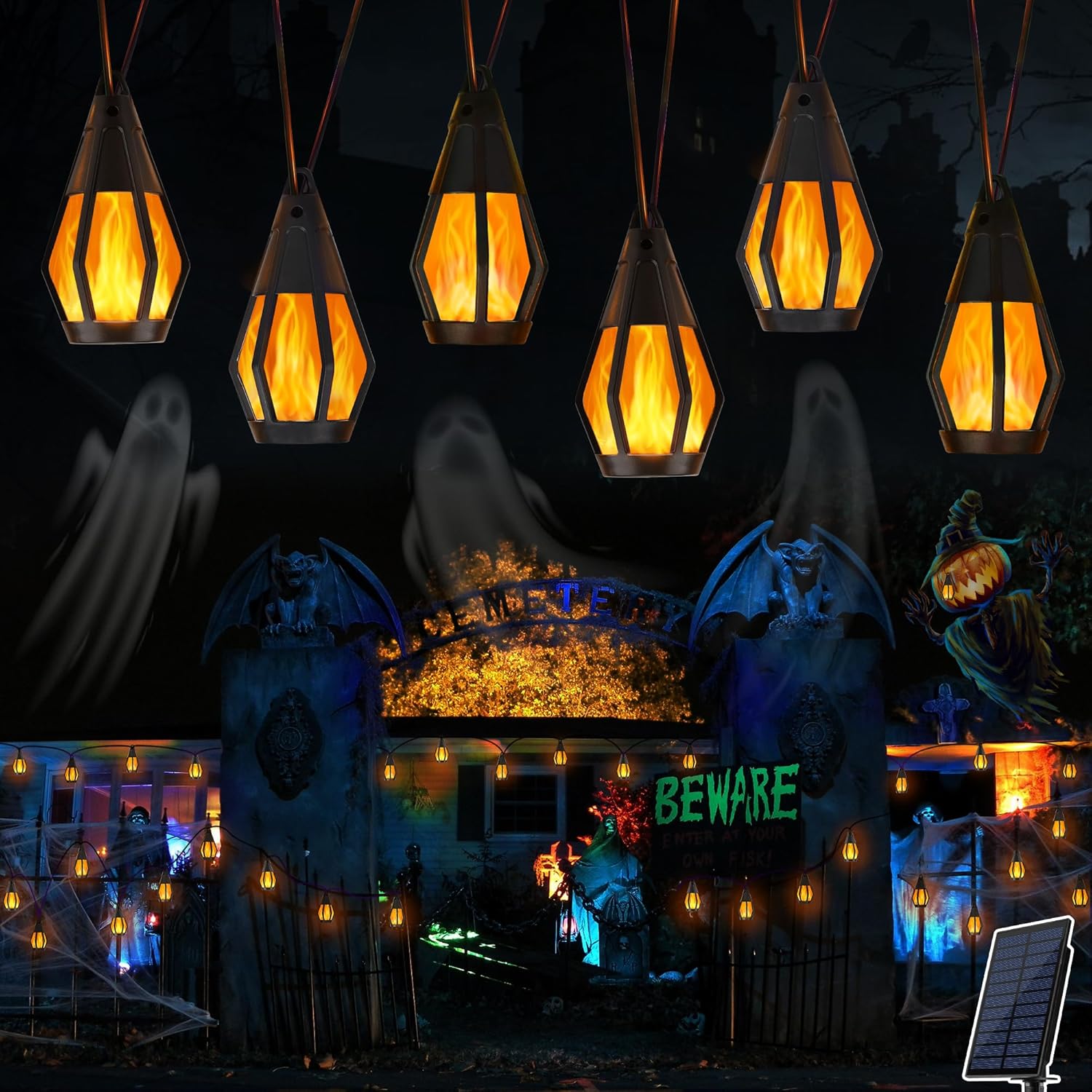 - Flickering Flame String Lights: 31ft flicker flame outdoor string lights with 10 flickering flame bulbs, and a detachable solar panel with an on/off switch located on the back. Light length 21ft, lead length 10ft,27.6 inches between bulbs.