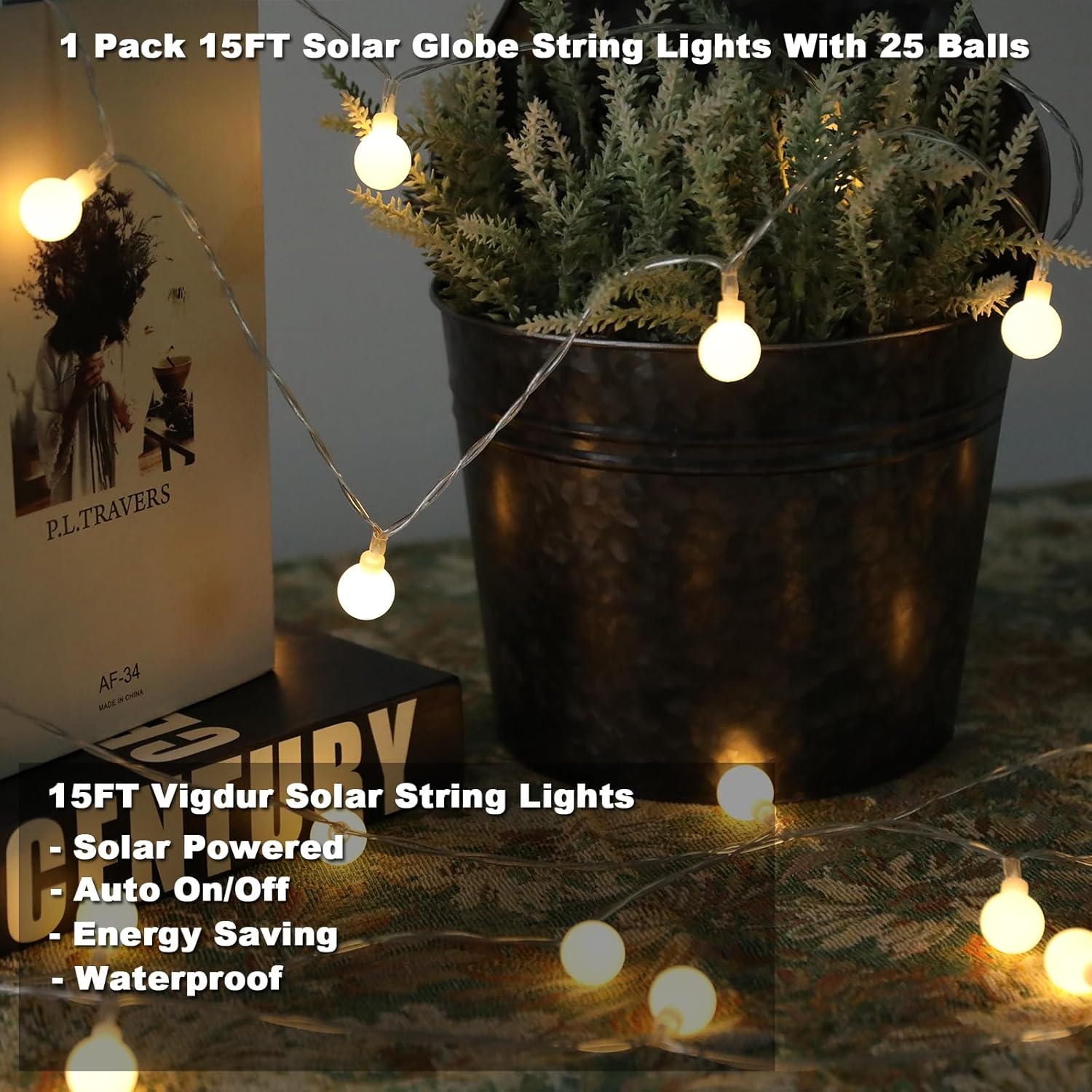- Solar Globe String Lights – These 15-foot solar-powered string lights, totally adorned with 25 crystal balls, each measuring 0.98 inches in diameter, outshines other globe string lights on the market with its brighter illumination. It is an ideal option for garden decoration, providing ample length to enhance your home and garden. These lights are perfect for creating a charming, romantic, and cozy ambiance during festive events